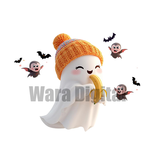 A playful winter ghost enjoying a banana, surrounded by cute bats, wearing a cozy knit cap—perfect for fun, seasonal, and whimsical digital designs.